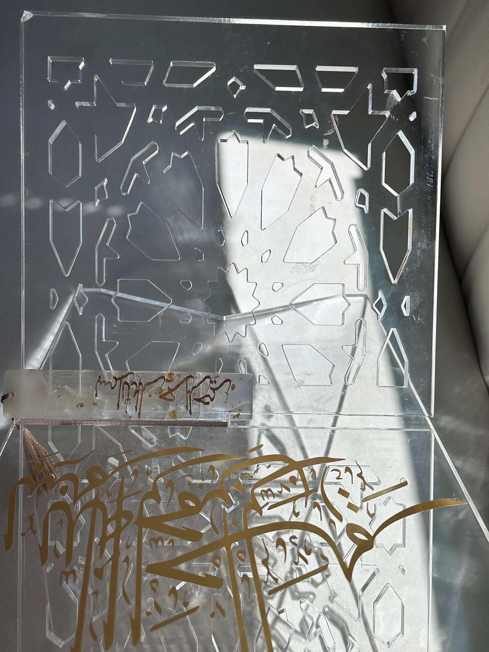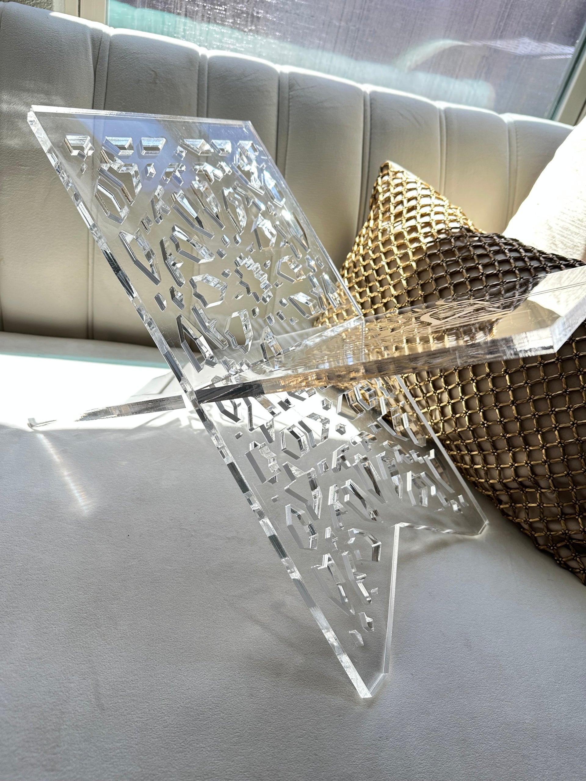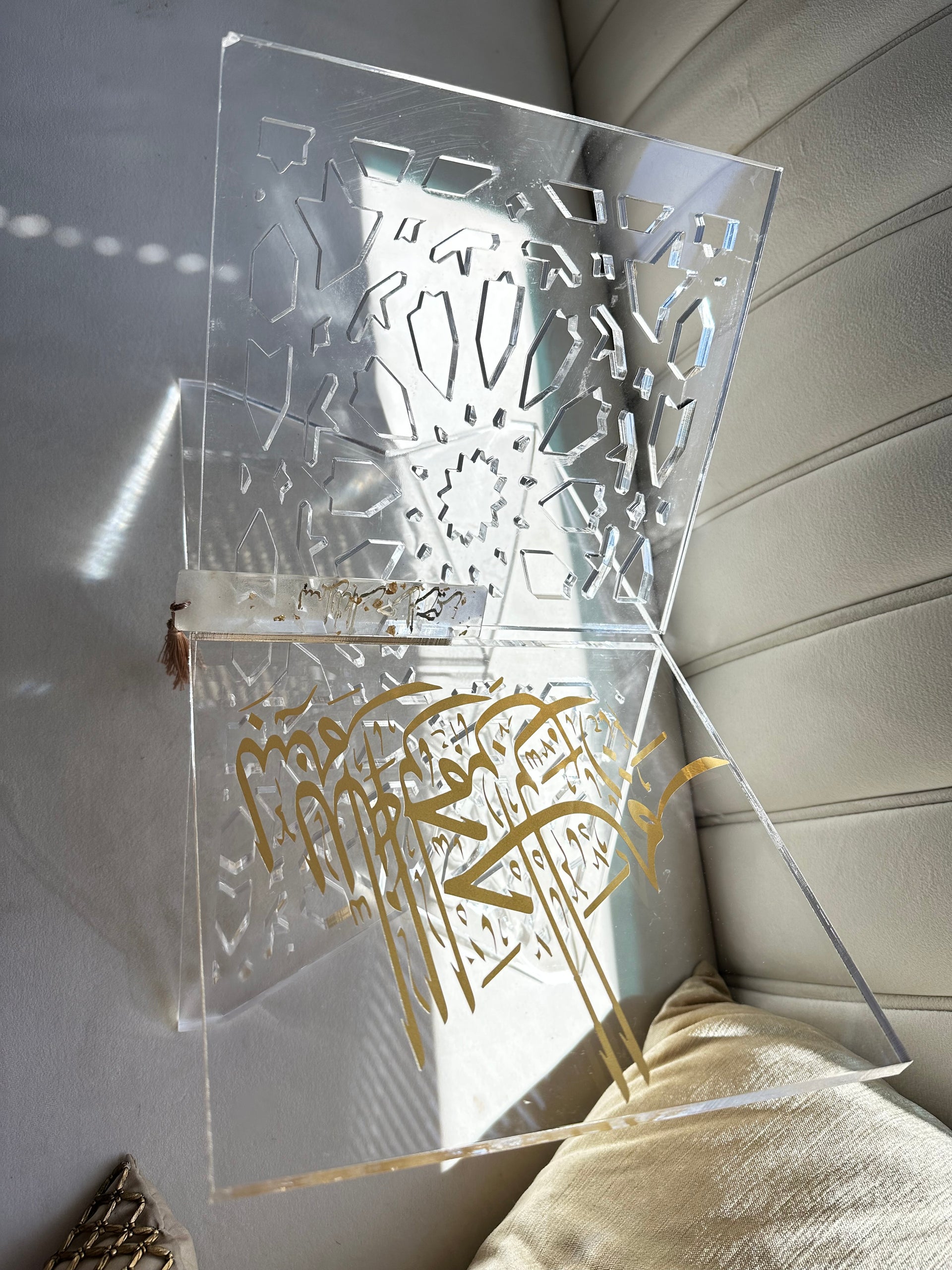 The Abstract Quran Stand is an exquisitely designed piece that marries spiritual significance with contemporary aesthetics. Crafted with transparent high-grade acrylic, it boasts a modern geometric pattern with meticulously laser-cut designs that allow light to pass through, creating a serene and reflective ambiance. The stand features elegant golden Arabic calligraphy that flows across its surface, bringing an element of traditional Islamic art into a modern context. This stand is not only a holder for the Holy Quran but also serves as a symbol of faith, an art piece that enhances the contemplative experience of reading and reflecting upon the sacred texts. It’s a harmonious addition to any space, offering a place of prominence for the Quran while adding to the beauty and spirituality of the environment.