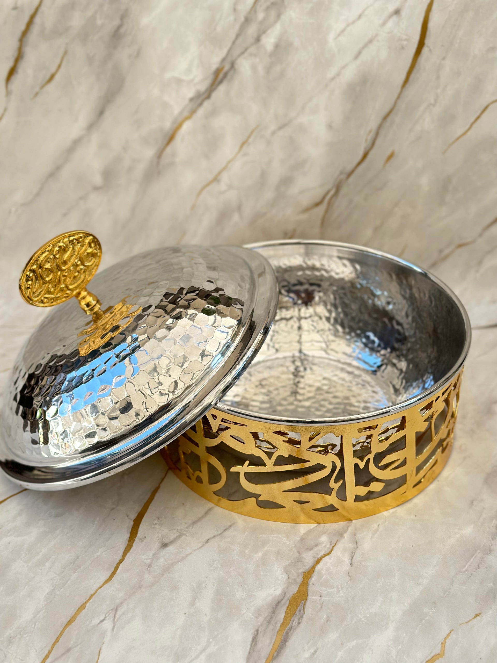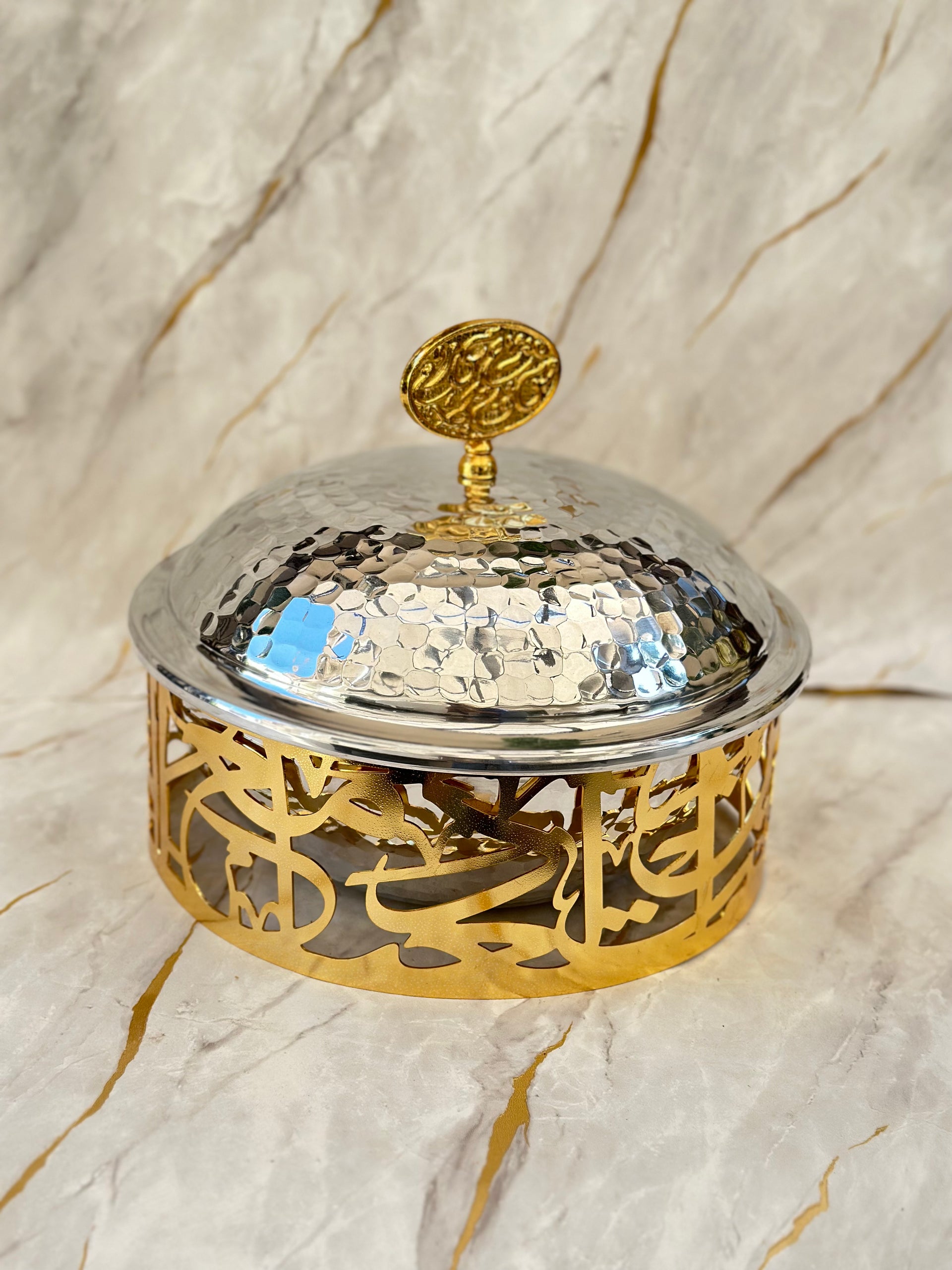 Admire our "Gilded Reflections" Dessert Dome, a blend of tradition and modernity. Its hammered silver dome reflects light, resting atop a golden base adorned with intricate Arabic calligraphy. Perfect for showcasing desserts, it's crowned with an ornate golden knob, making it an ideal centerpiece for festive gatherings or everyday luxury.