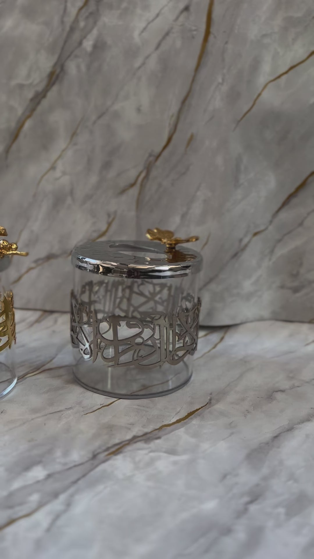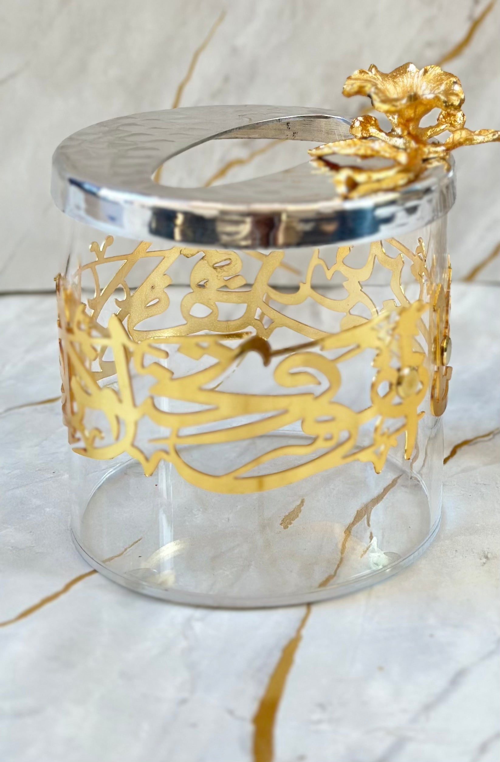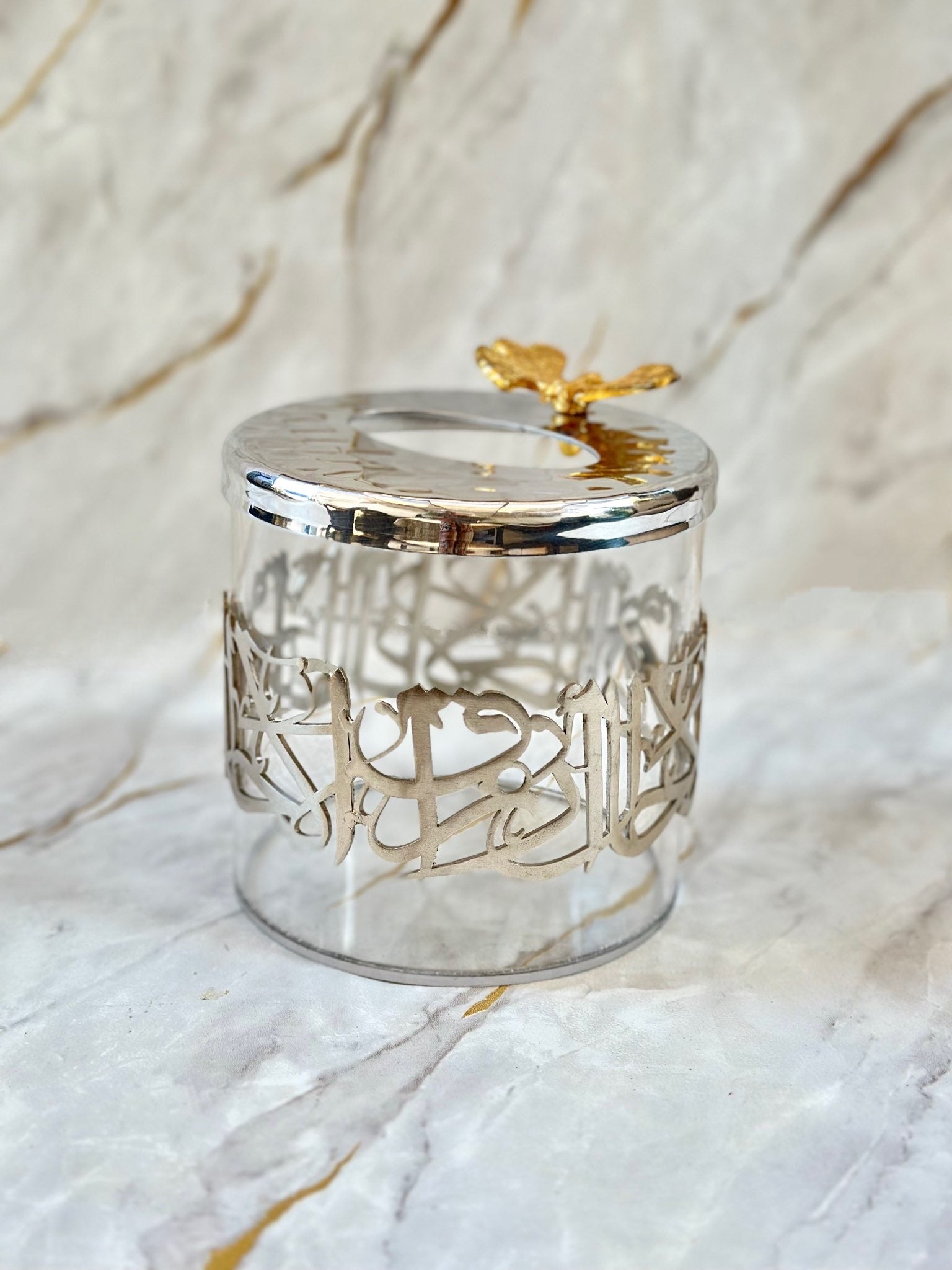 Elevate your dining experience with our handcrafted acrylic napkin holder, detailed with ornate Arabic calligraphy in metallic accents. The gleaming gold emblem adorning the lid transforms this everyday item into a centerpiece of cultural artistry and elegance.