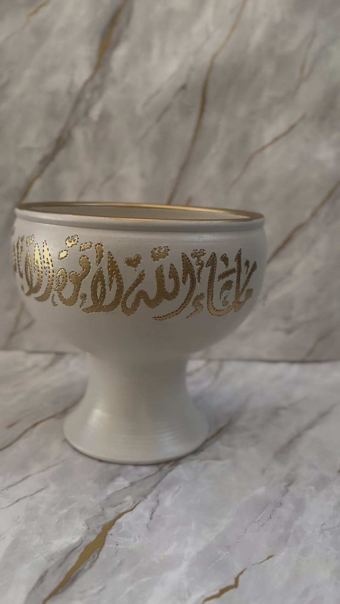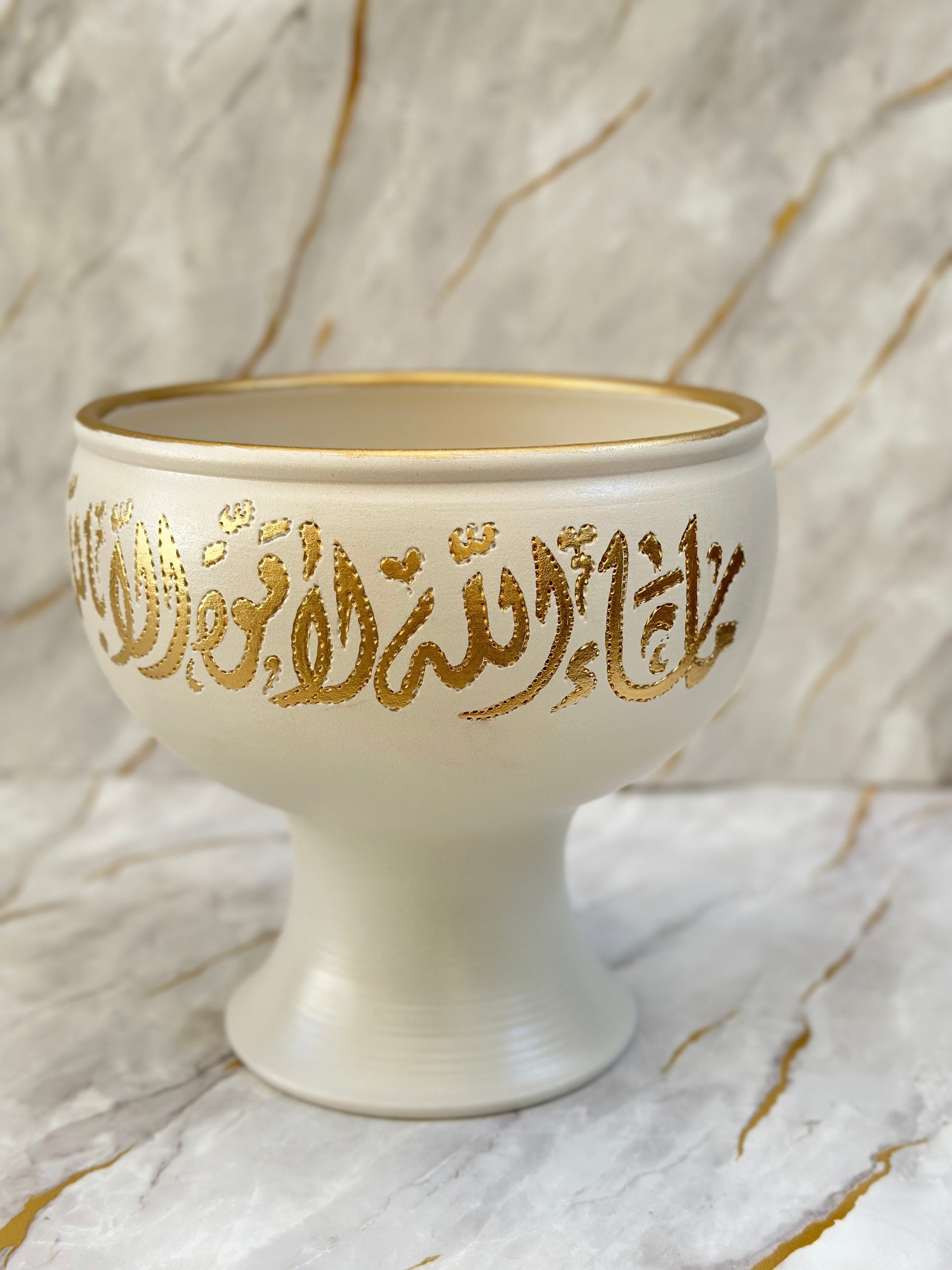 Our Ceramic Pedestal Bowls are a fusion of elegance and tradition, designed to enrich your home with a touch of the divine. Each bowl features Arabic calligraphy with لا اله الا الله محمد رسول الله in opulent gold, set against a vibrant turquoise or a serene cream backdrop. Perfect for being used as decorative pieces, these bowls are a captivating addition to any room.