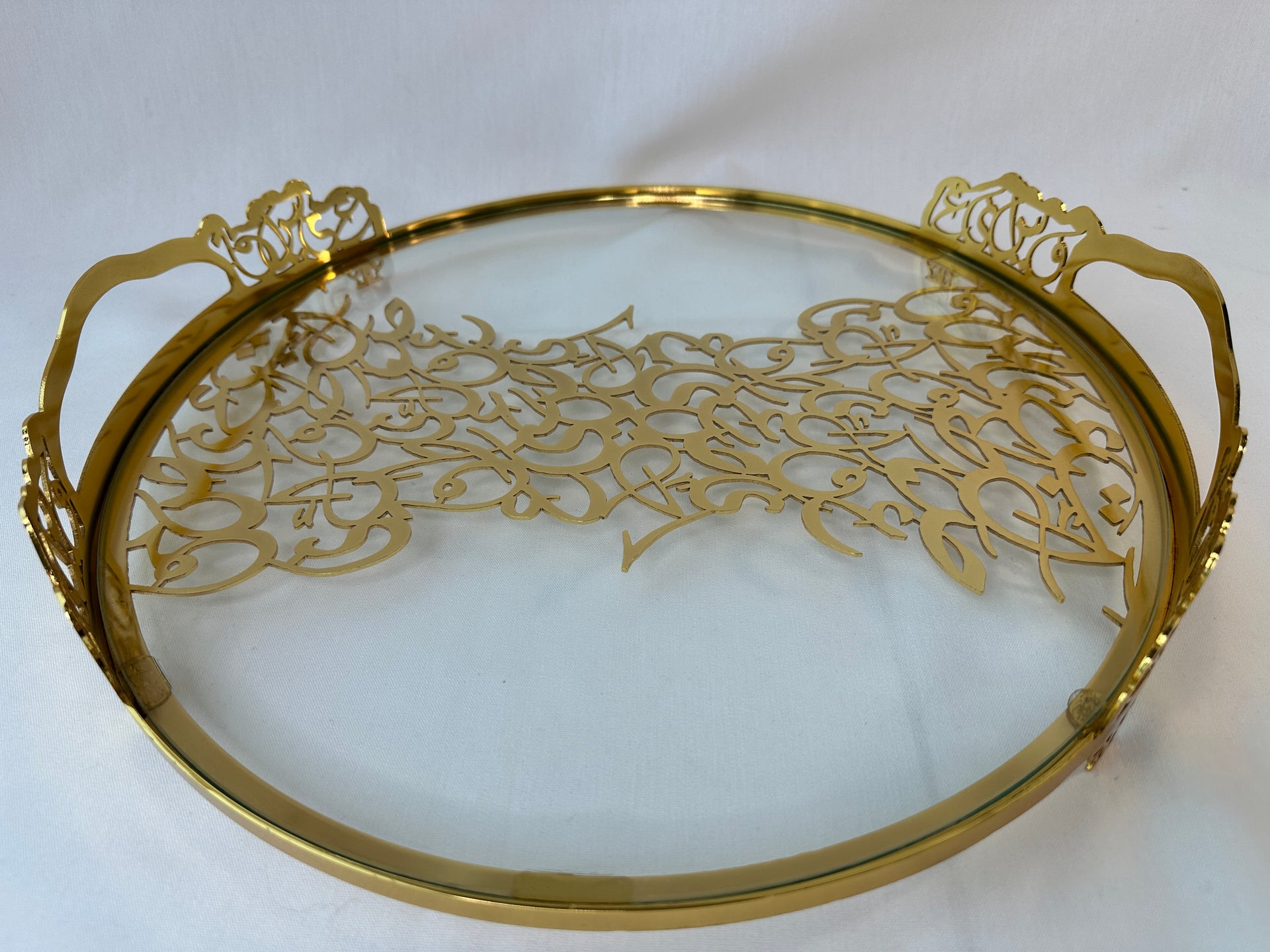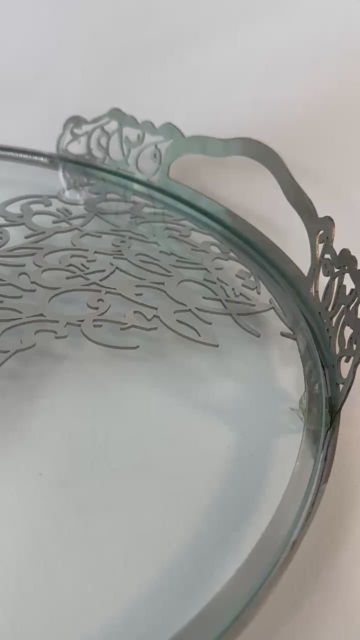 Elevate your hosting experience with this exquisite Arabic calligraphy serving tray, available in gold and silver finishes. This beautifully crafted tray features intricate Arabic calligraphy cutouts, adding a touch of elegance and cultural significance to any space. The covered glass design ensures durability while maintaining a luxurious aesthetic.