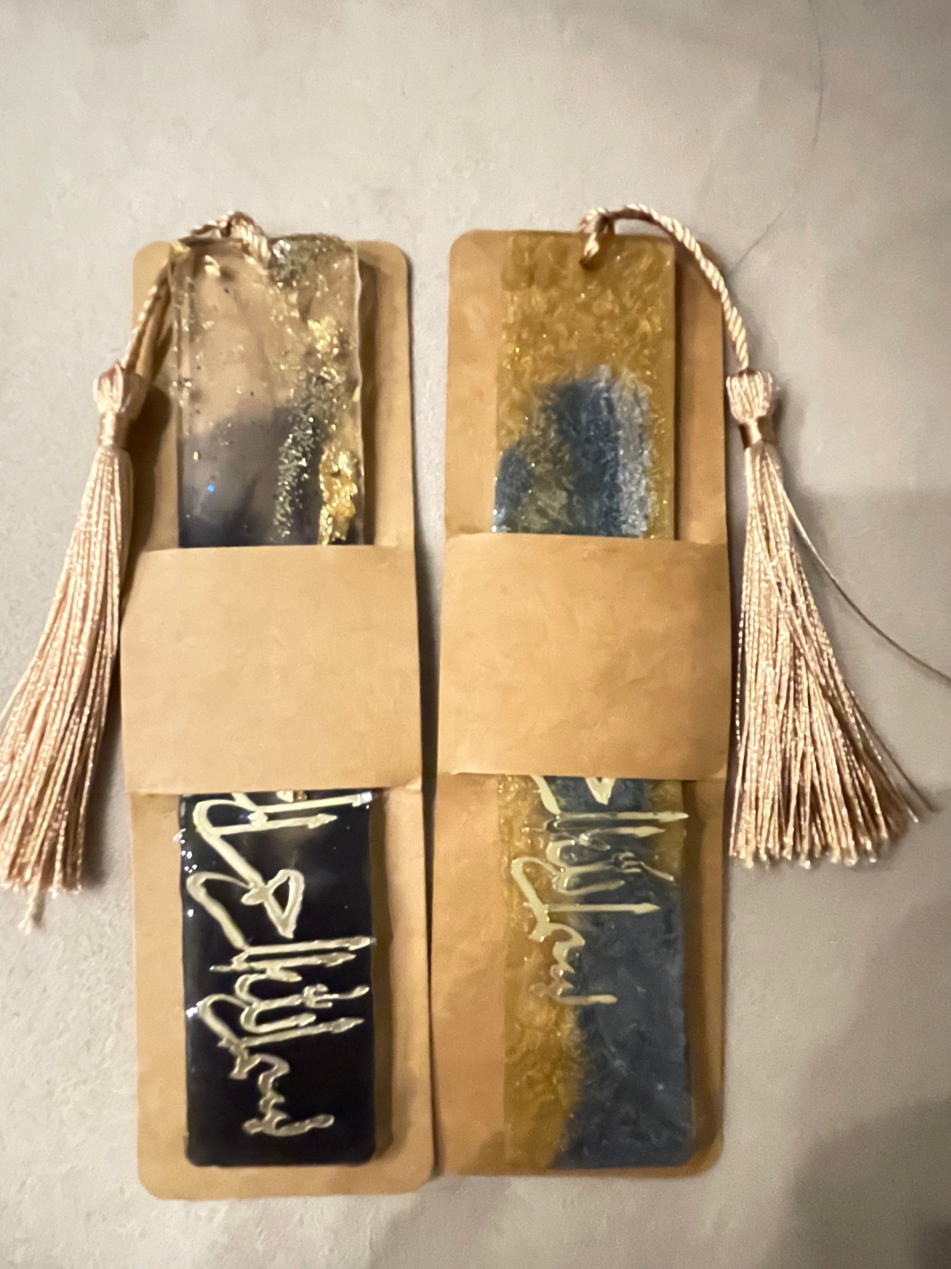 Delve into our Handmade Resin Bookmark, celebrating artisanal finesse with delicate Arabic calligraphy. Each piece features a harmonious blend of gold and blue tones, enhanced by sparkling glitter. Crafted from resilient, hand-poured resin, it gleams with a glossy finish that captures and reflects light beautifully. Perfect for both avid readers and collectors seeking a touch of elegance.