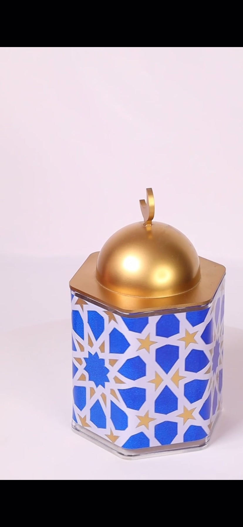 This elegant hexagonal jar features a striking blue and gold geometric pattern inspired by traditional Islamic art. Topped with a golden dome and crescent moon, it captures the essence of Ramadan’s spirit and beauty. Perfect for gifting dates, sweets, or small treats, this decorative piece adds a meaningful touch to any home during the holy month. Ideal as a special Ramadan gift for loved ones or as a centerpiece for your festive gatherings.
