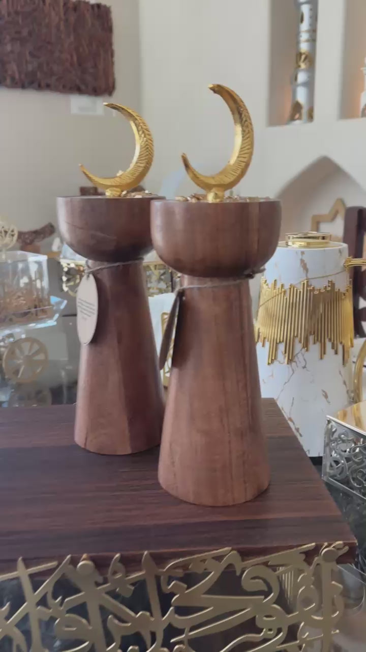Add warmth and elegance to your space with these beautifully handcrafted wooden candle holders, adorned with a golden crescent moon. Perfect for Ramadan, Eid, or as a timeless centerpiece for your home.