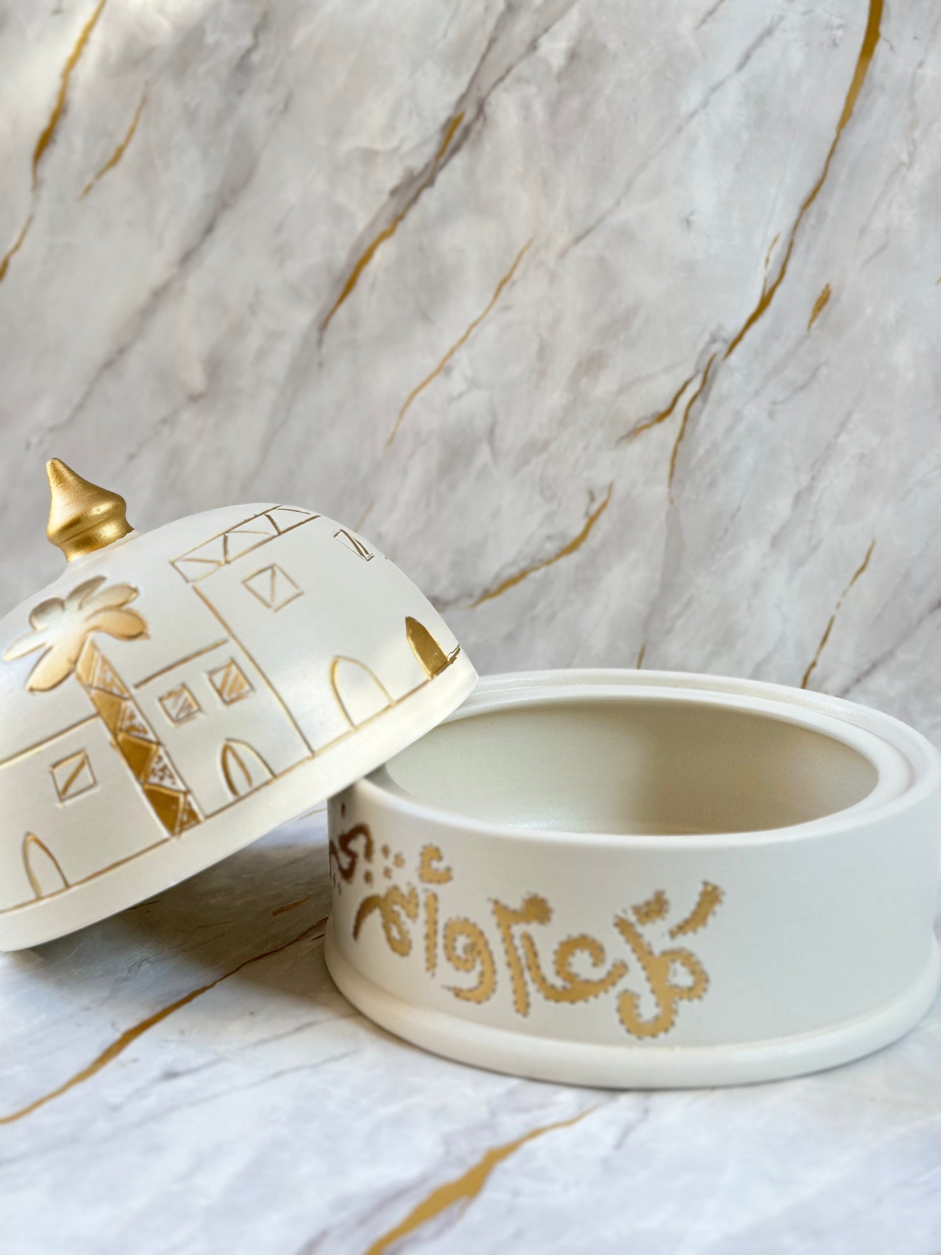 Impress your guests with our Handmade Ceramic Eid Chocolate Bowl, beautifully crafted with traditional gold calligraphy and intricate patterns. Whether used for serving chocolates or as a statement decor piece, it embodies the spirit of Eid with grace and elegance.