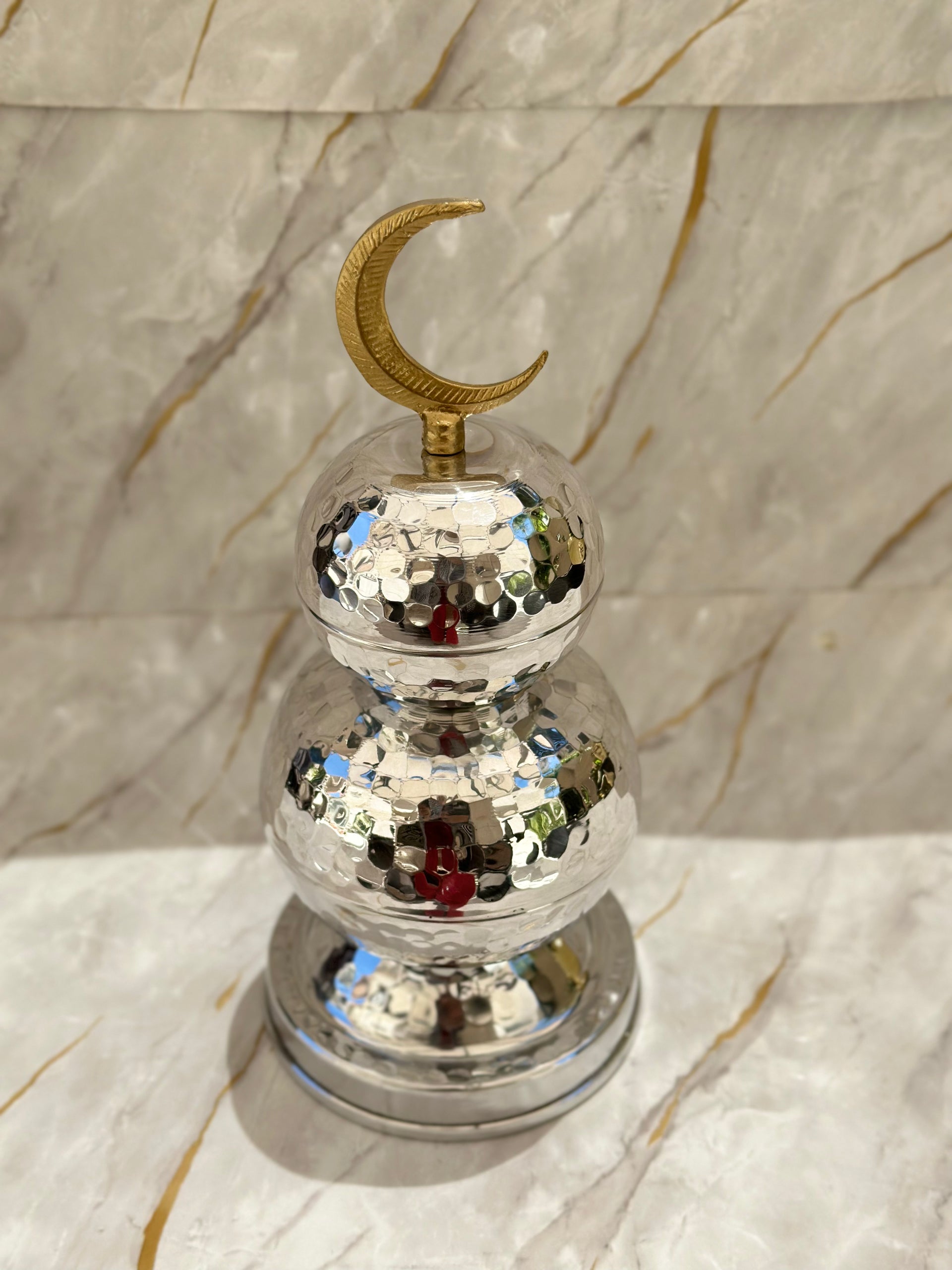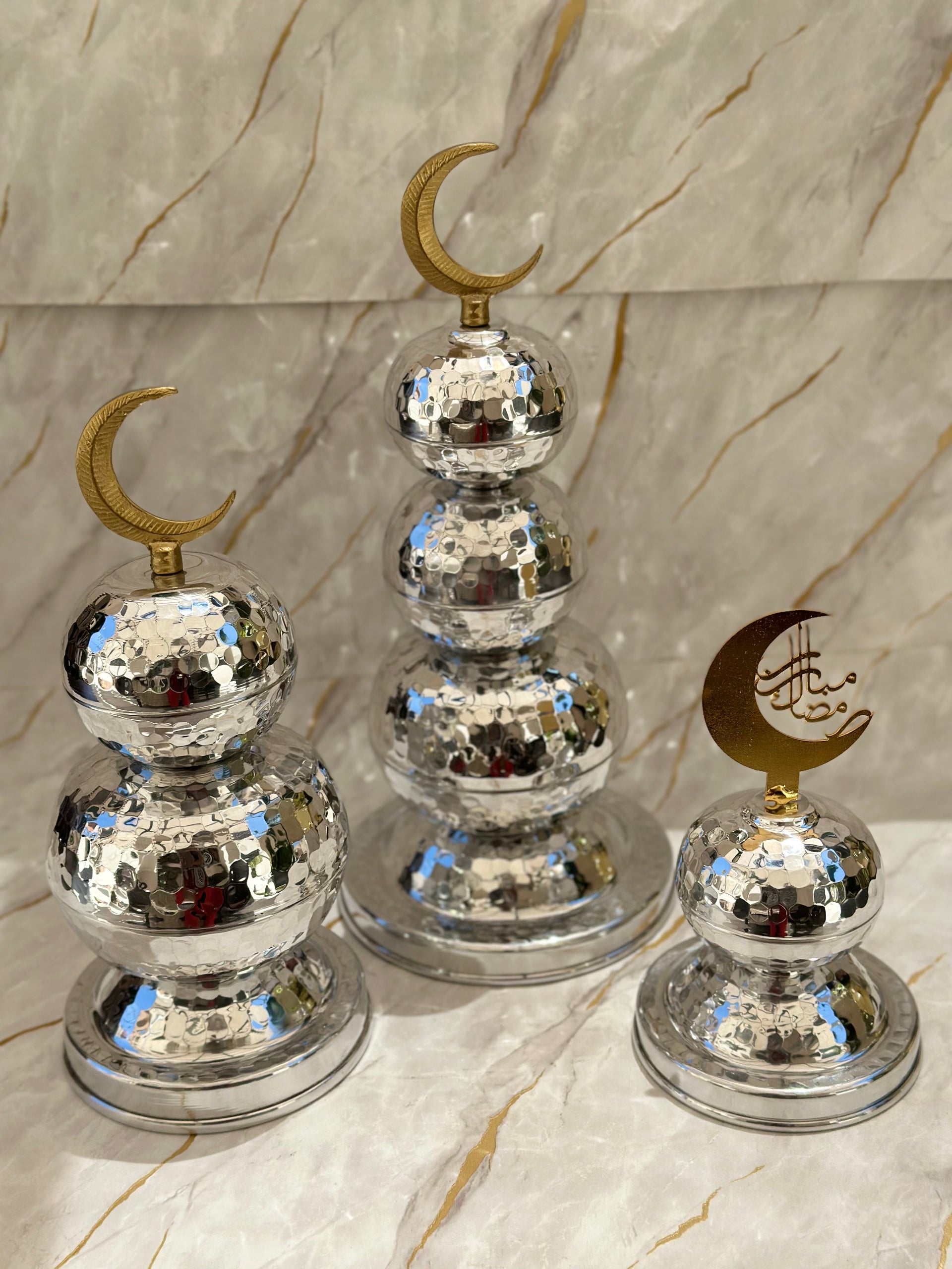 Adorn your home this Ramadan with our exquisite set of three Crescent Minaret Decorations. Each piece is thoughtfully crafted to capture the essence of the holy month, featuring a stack of mirrored spheres that glisten with reflected light, culminating in a golden crescent moon ('hilal') at the pinnacle, symbolizing the arrival of Ramadan.
