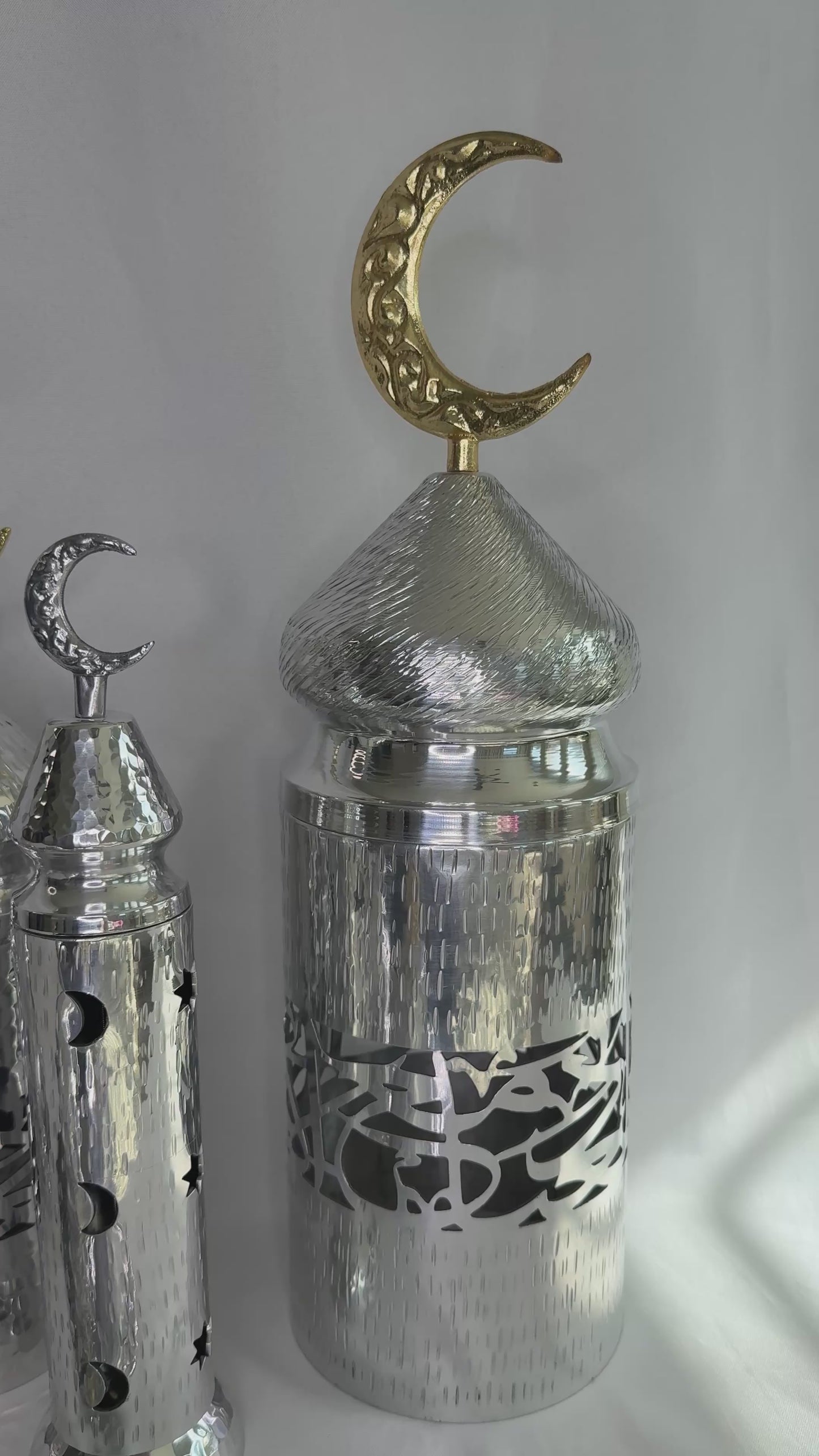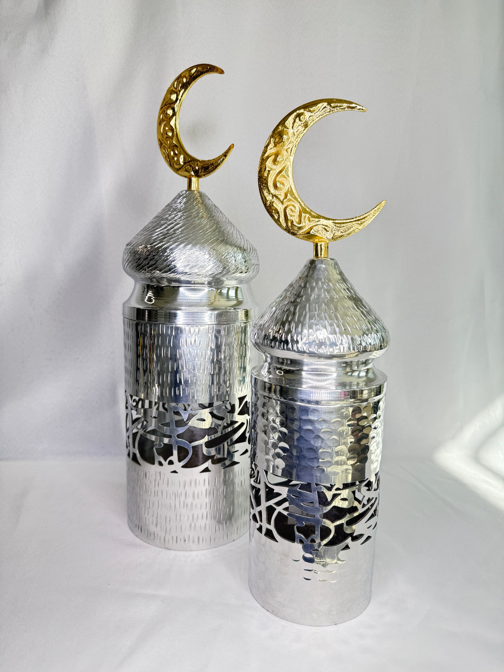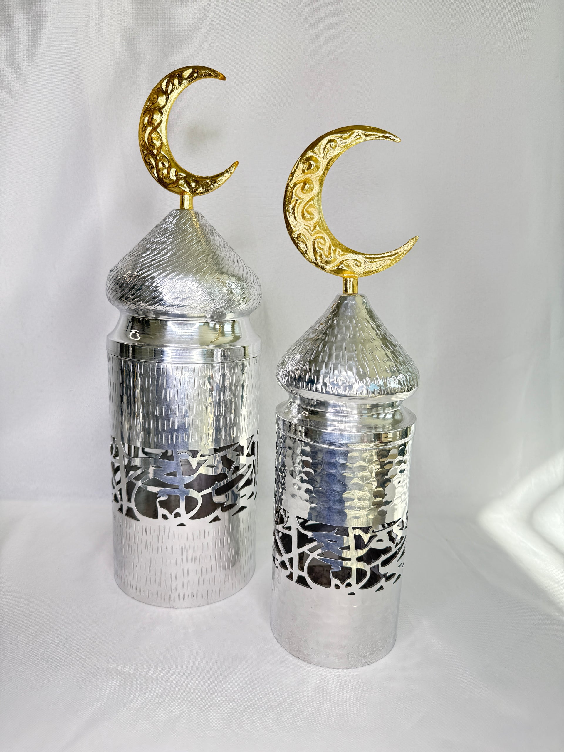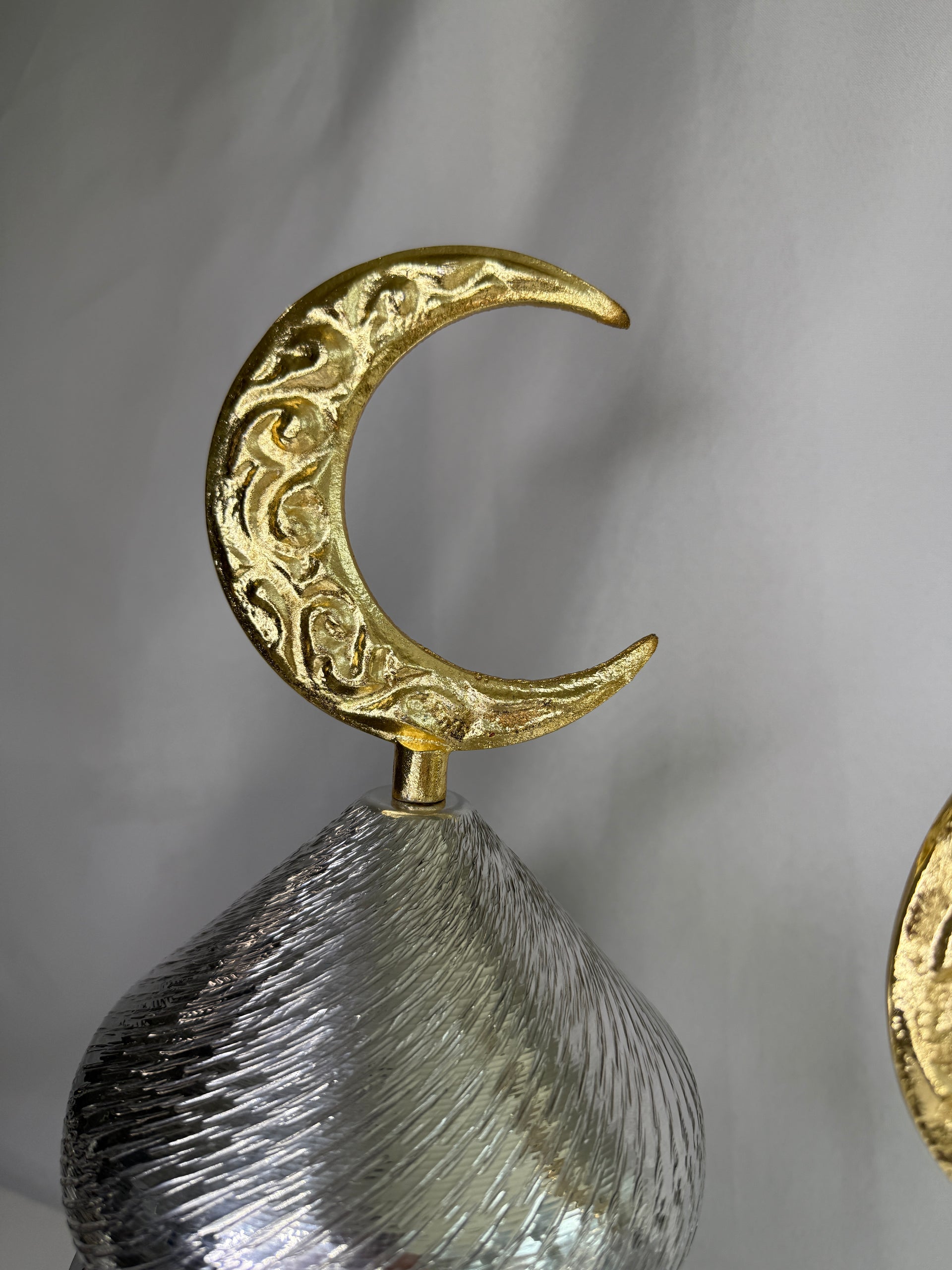 Embrace the fusion of elegance and charm with this set of two minarets , each adorned with a stunning hammered silver finish and featuring luxurious golden accents. The minarets bodies showcase a beautiful blend of textures, with a clear glass lower half enhanced by a decorative golden filigree band, and an upper half that gleams with a metallic texture. Crowned with exquisite golden crescent moon handles, these minarets are not only storage solutions but also unique art pieces. Each minaret measures [insert dimensions] and makes an ideal addition to any kitchen, living space, or as a standout piece in a display cabinet.