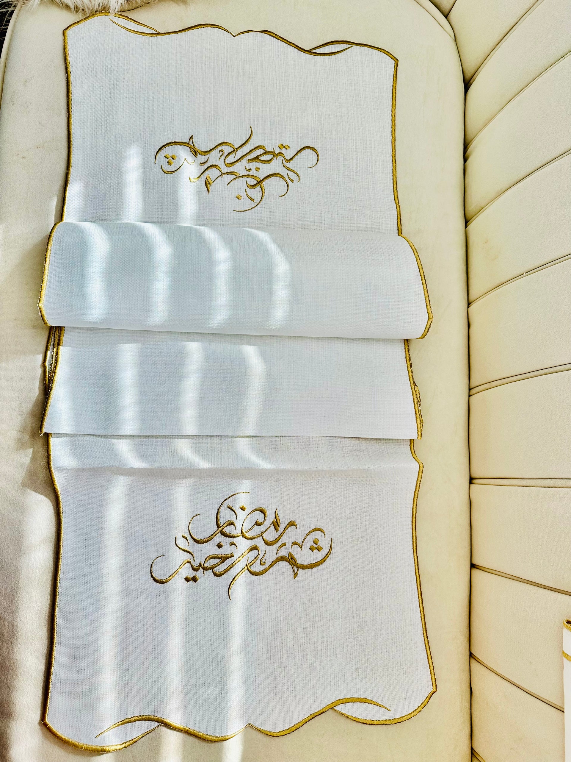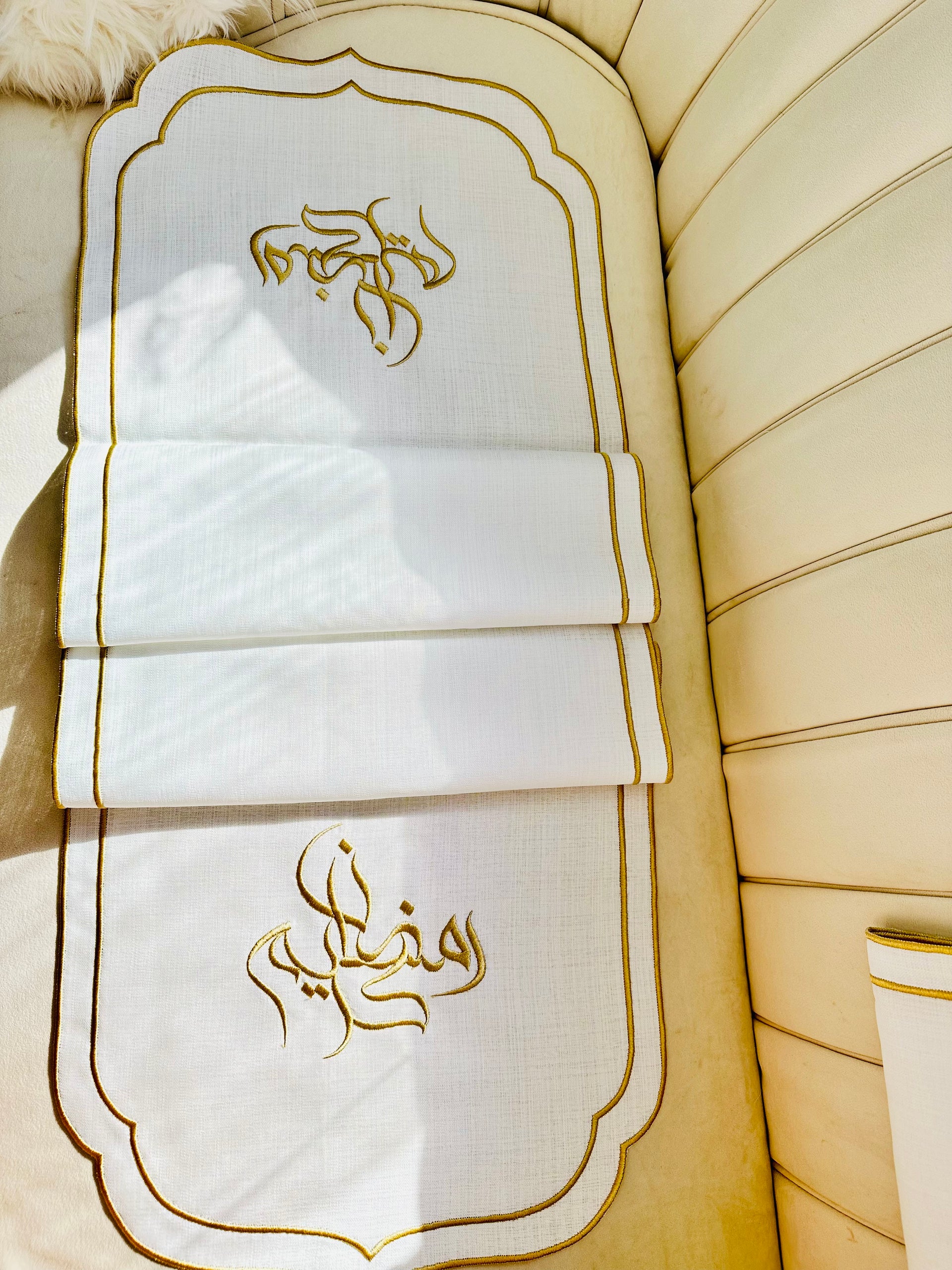 Elevate your dining table with this luxurious runner, crafted from the highest quality cotton linen for a sophisticated touch. This exquisite piece is not only aesthetically pleasing but also functional, featuring antibacterial properties to ensure your dining experience is both elegant and hygienic. Designed for convenience, it is machine washable, allowing for easy care. The runner is adorned with golden embroidery, showcasing intricate Arabic calligraphy that adds a rich cultural flair to your table setting. Each detail is carefully embroidered, giving a lustrous contrast against the crisp white linen, bordered with a golden trim that exquisitely frames the design. This runner is an embodiment of elegance and tradition, perfect for those who appreciate fine dining and cultural beauty.