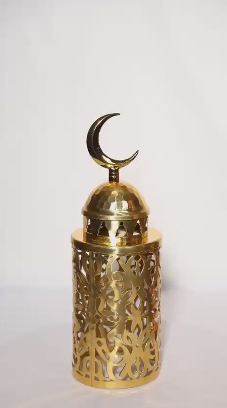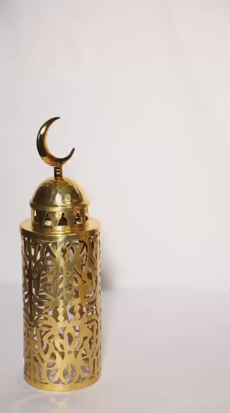 Elevate your décor with this exquisite pair of gold crescent lanterns, crafted with intricate openwork patterns inspired by traditional Arabic artistry. Each lantern features a beautifully hammered dome topped with a shining crescent moon, adding a touch of spiritual elegance. The detailed filigree design allows light to cast stunning patterns, making these lanterns perfect for Ramadan, festive gatherings, or luxurious home accents. A blend of craftsmanship and timeless charm, they bring warmth, culture, and sophistication to any space.