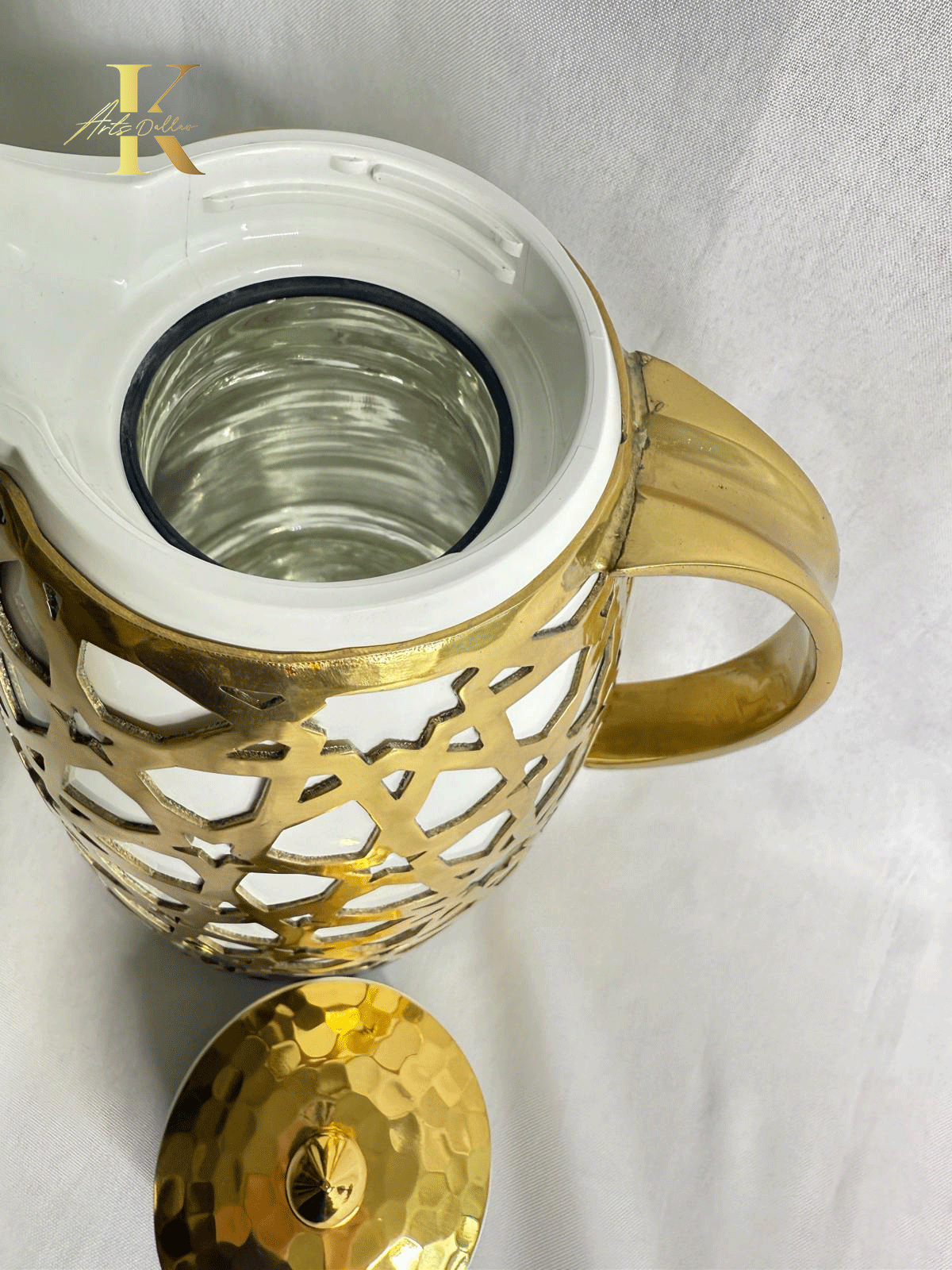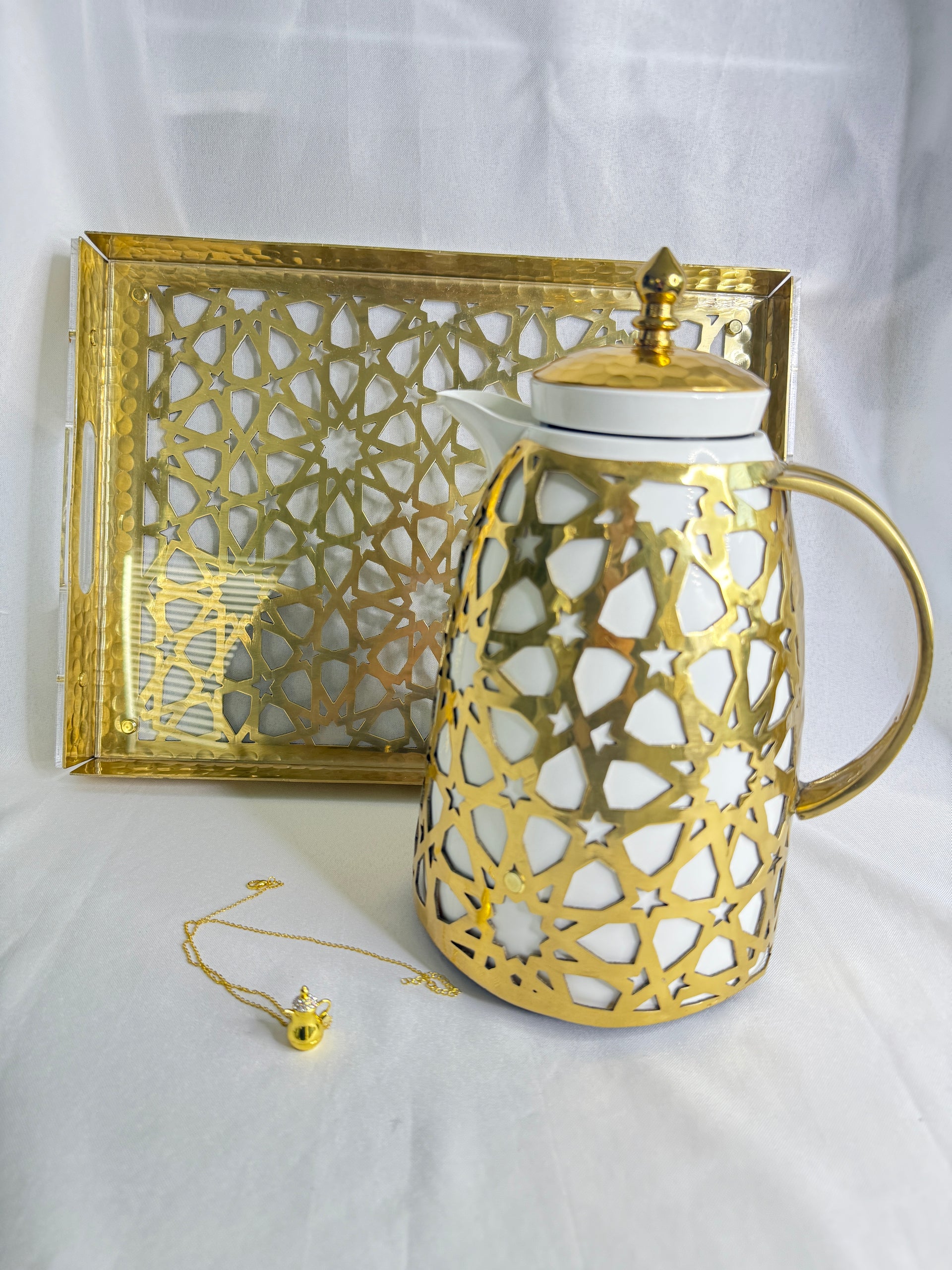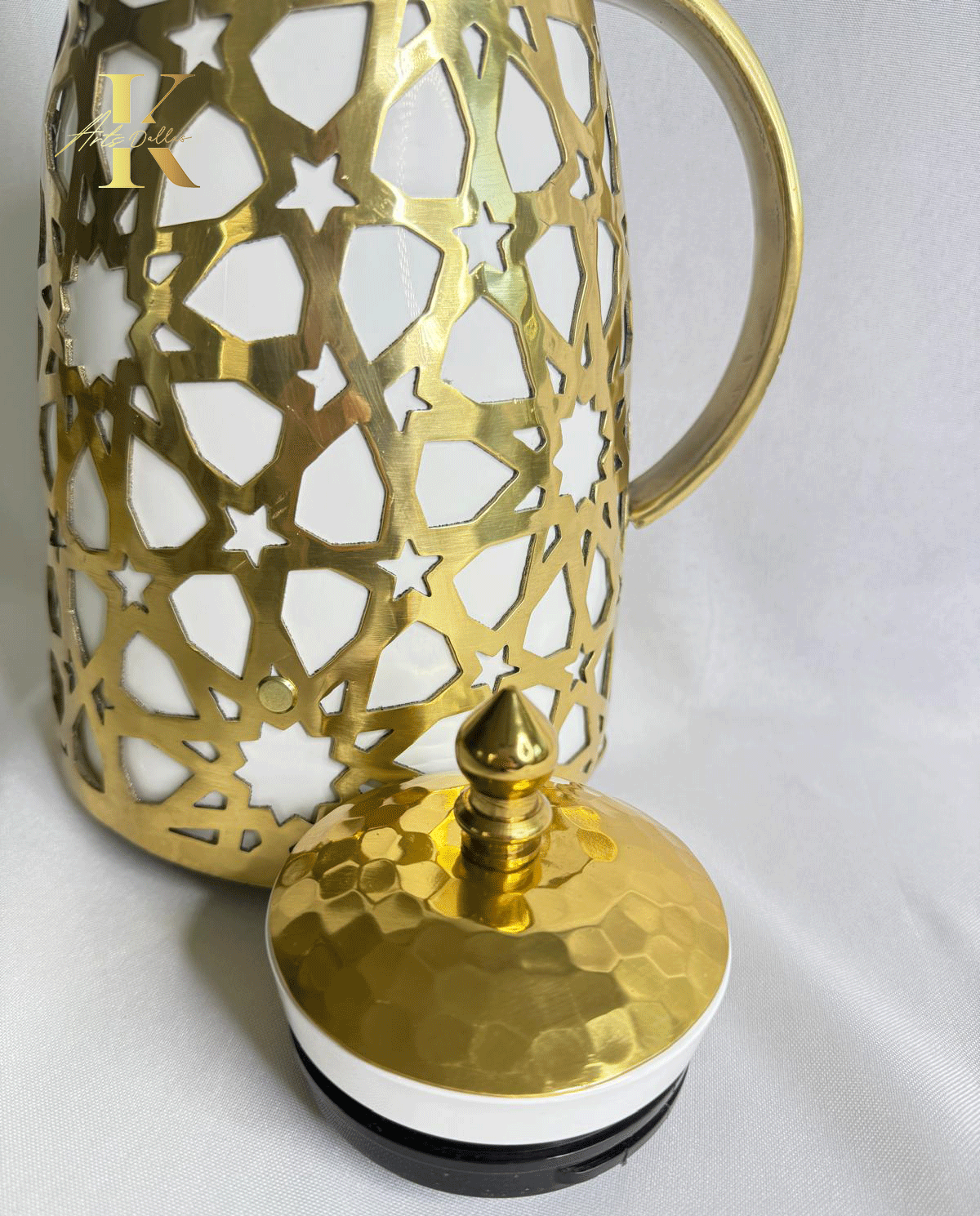 Serve your guests in style with this elegant thermos, adorned with intricate Arabic-inspired patterns in a luxurious gold finish. The inner flask is made in Germany, ensuring premium quality and performance — keeping your beverages hot for up to 24 hours. A perfect blend of art and functionality, this thermos adds a refined, cultural touch to your coffee or tea setup.